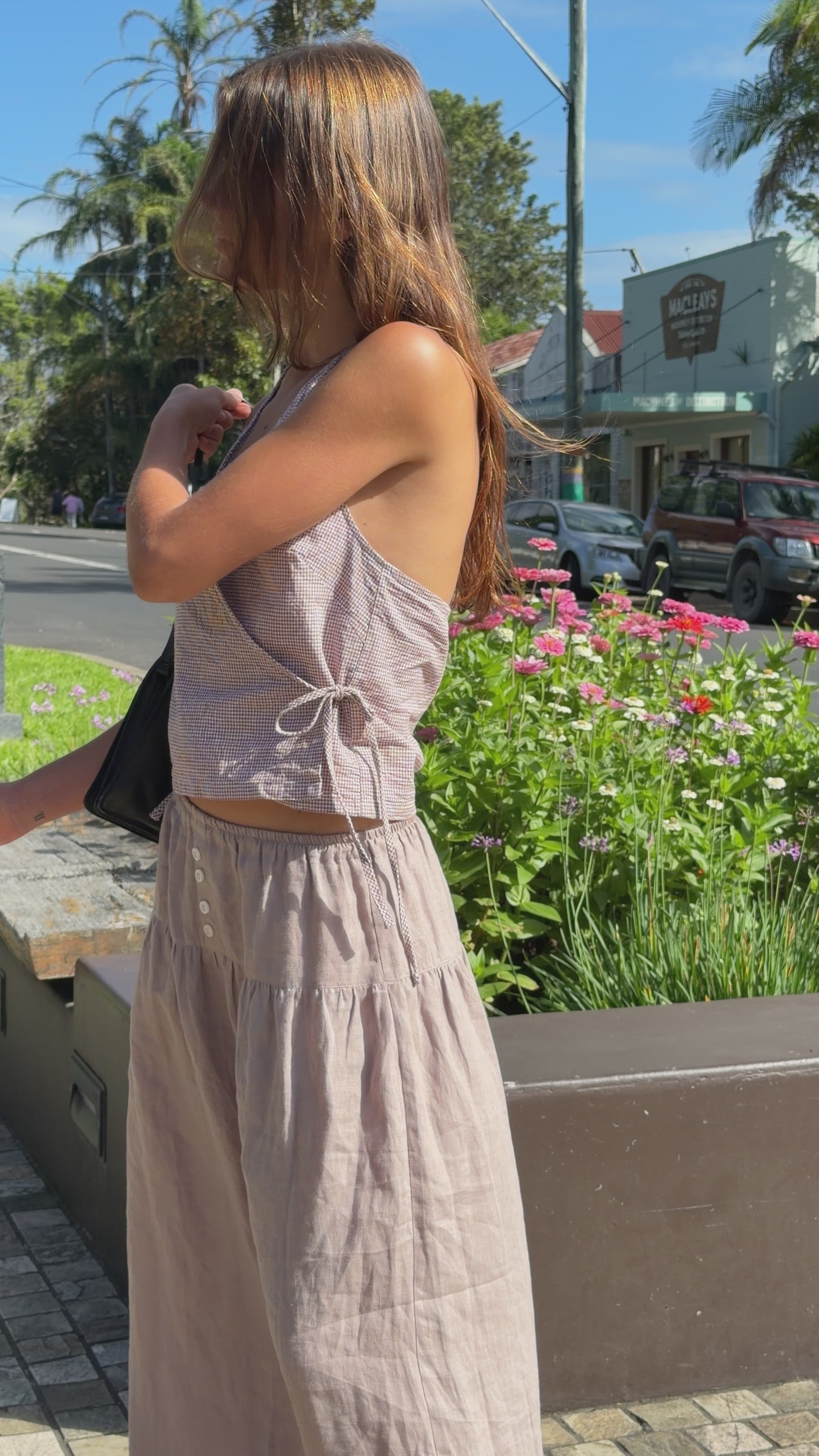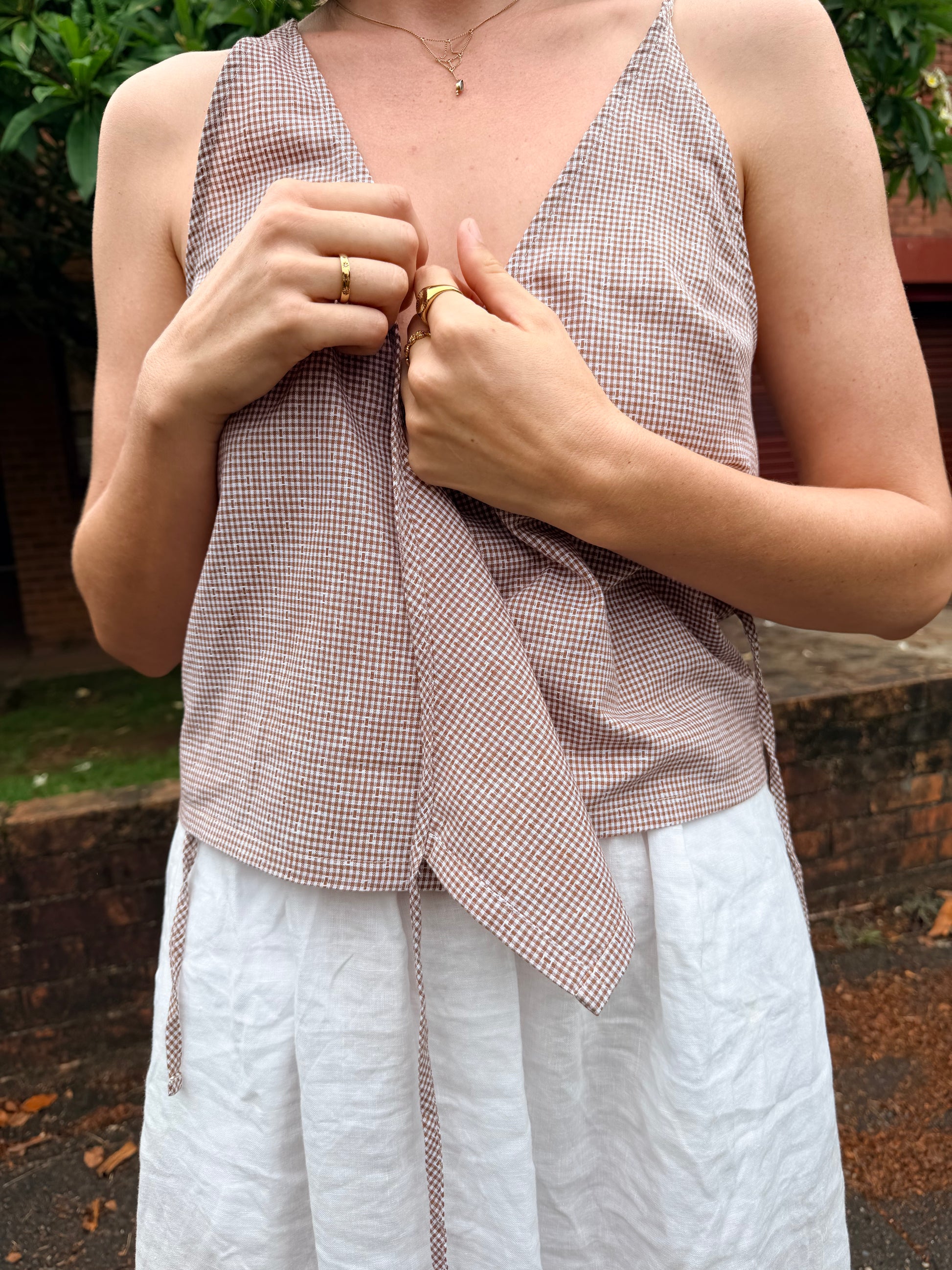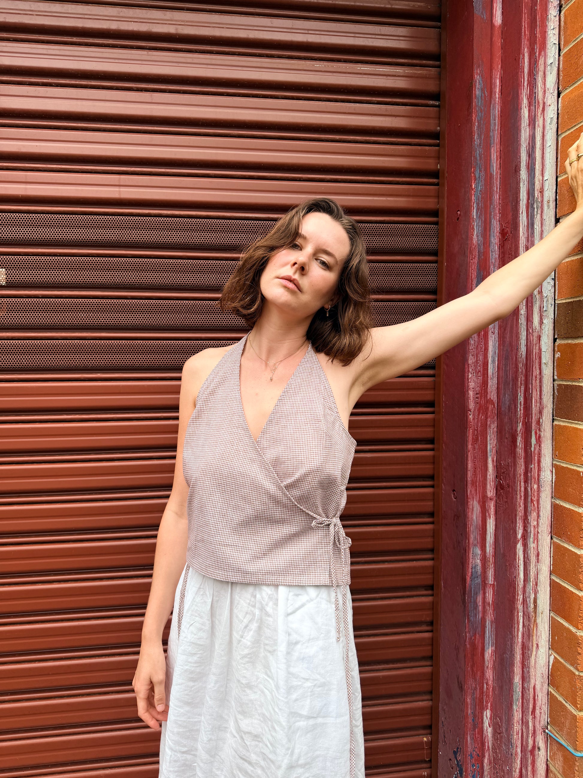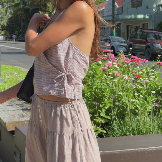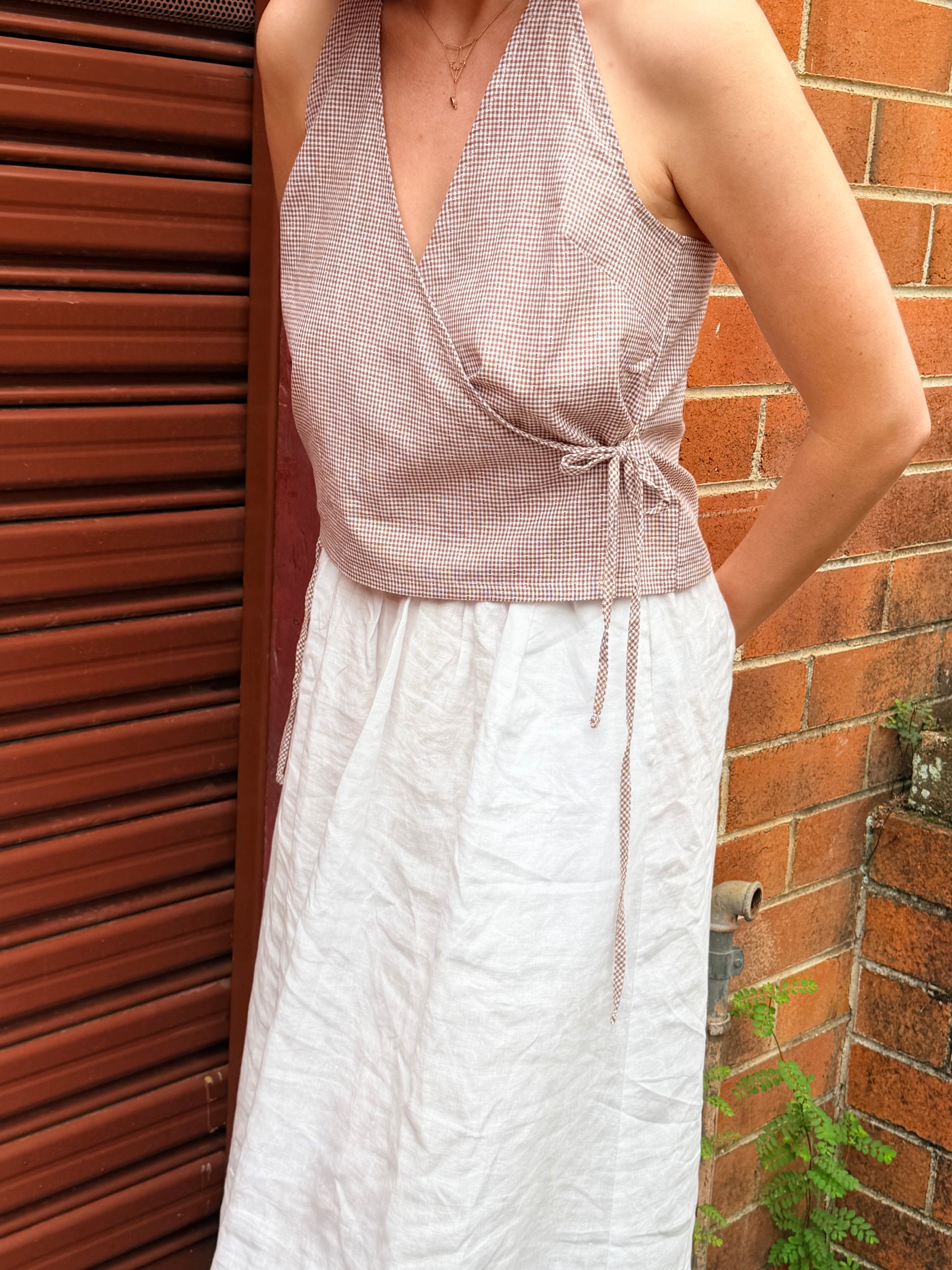 The cross over halter top with an open back and adjustable ties at the neck and waist. Designed with a wrap-style front for a clean, minimal shape.