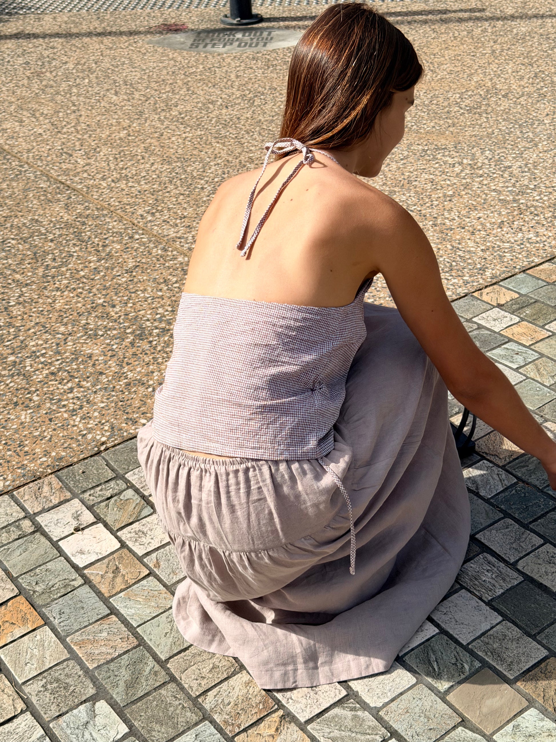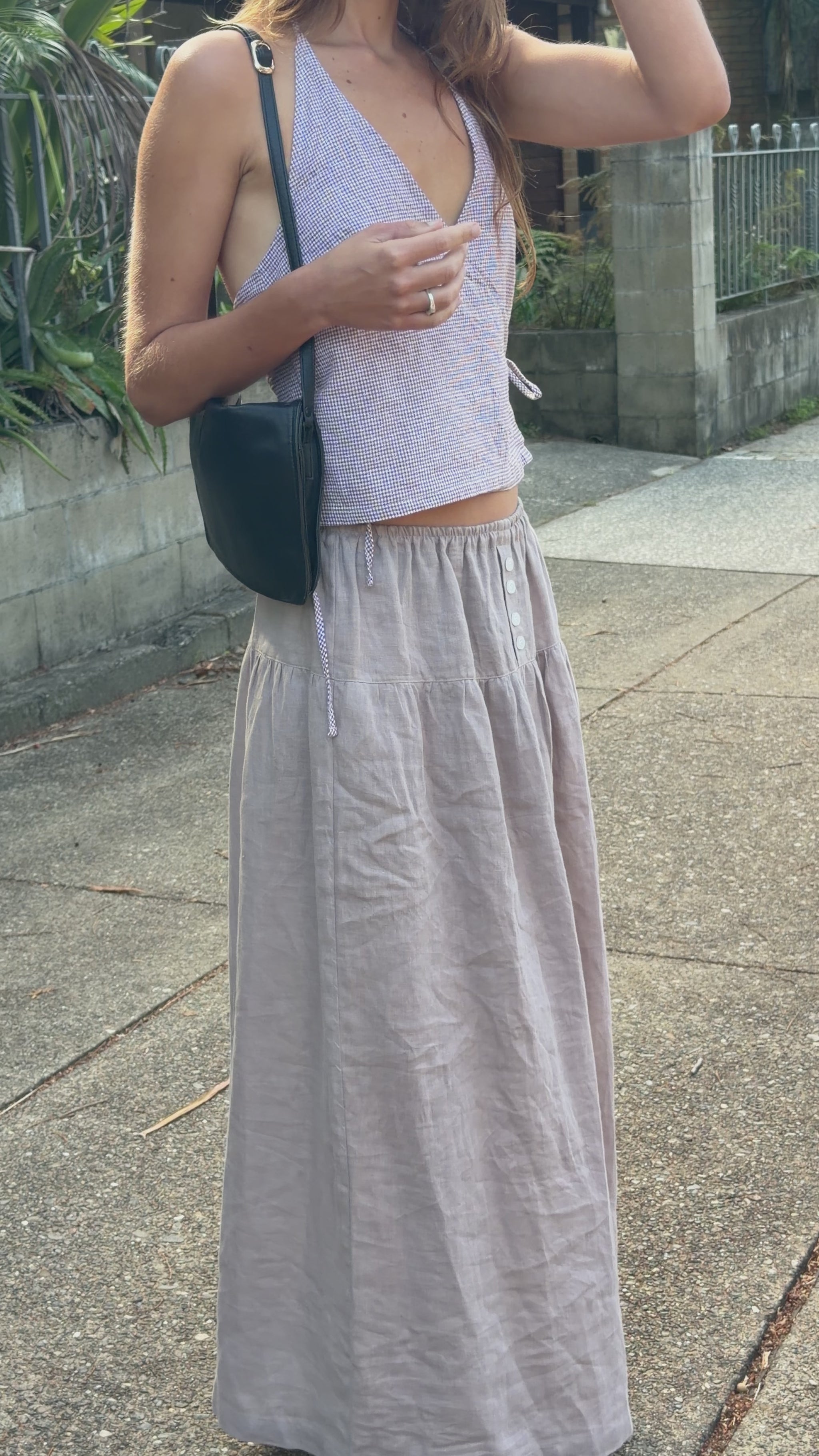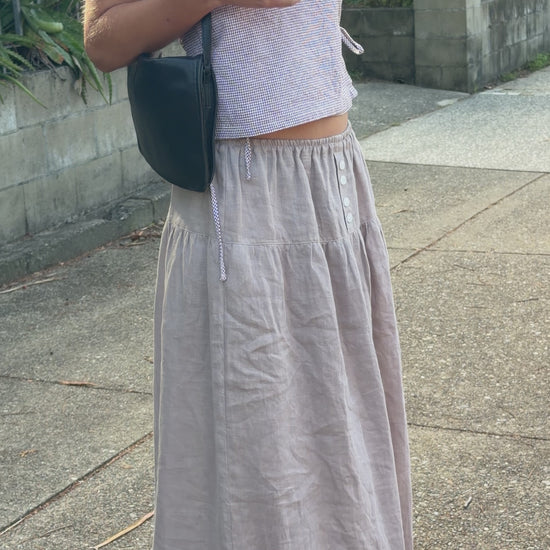 Designed to be worn two ways, the Four Button Skirt moves easily between skirt and simple dress. Soft elastic through the waist offers comfort and flexibility, while a faux button-front detail at the centre creates a quiet point of interest. Gentle gathers add softness and shape for a sweet, effortless finish.