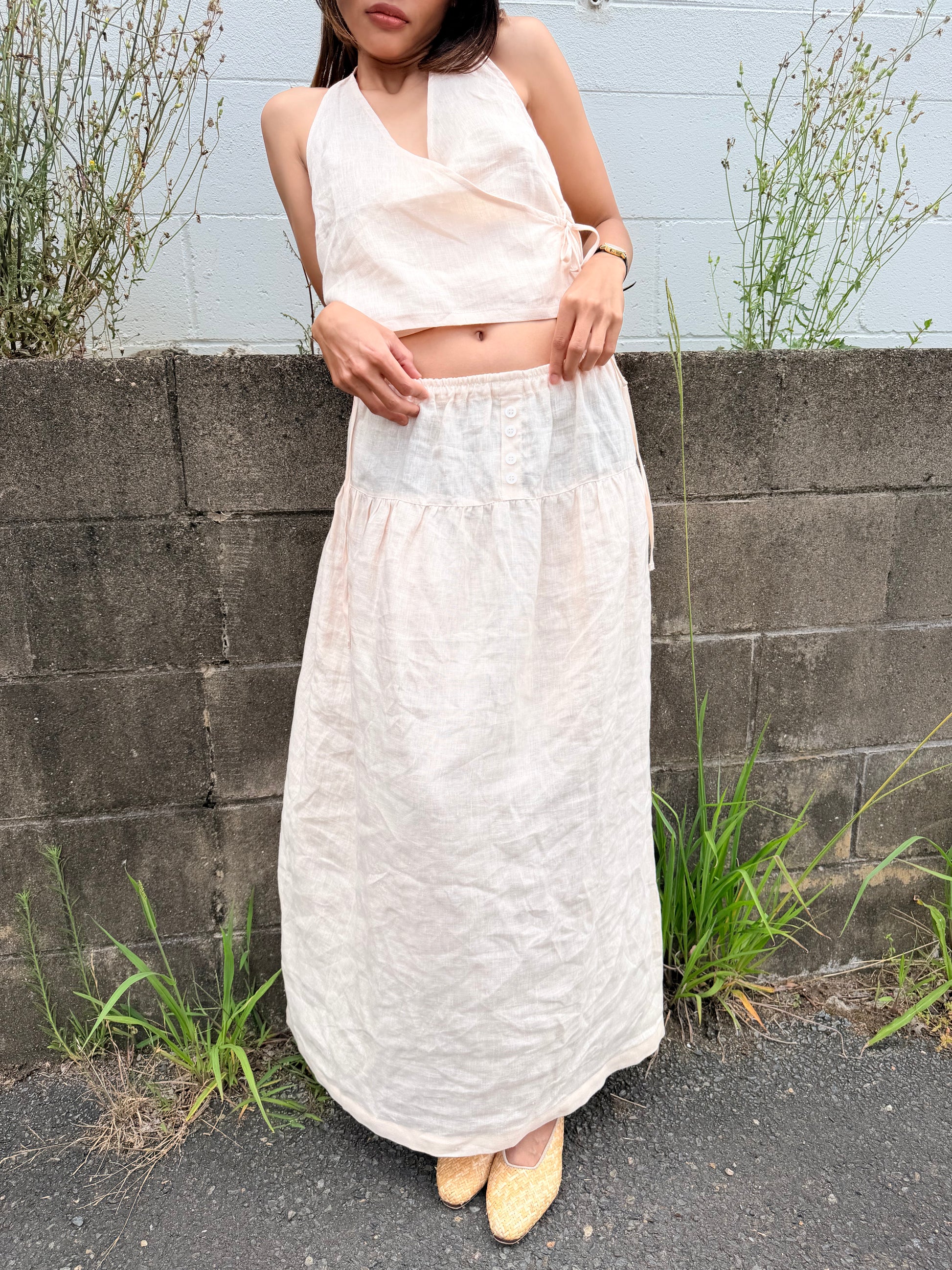 Designed to be worn two ways, the Four Button Skirt moves easily between skirt and simple dress. Soft elastic through the waist offers comfort and flexibility, while a faux button-front detail at the centre creates a quiet point of interest. Gentle gathers add softness and shape for a sweet, effortless finish.