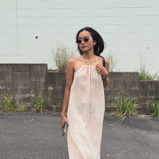A simple halter dress designed with an open, softly gathered back. Elastic through the back offers gentle support and ease, while a tie at the neckline creates a delicate gathered effect through the bodice.