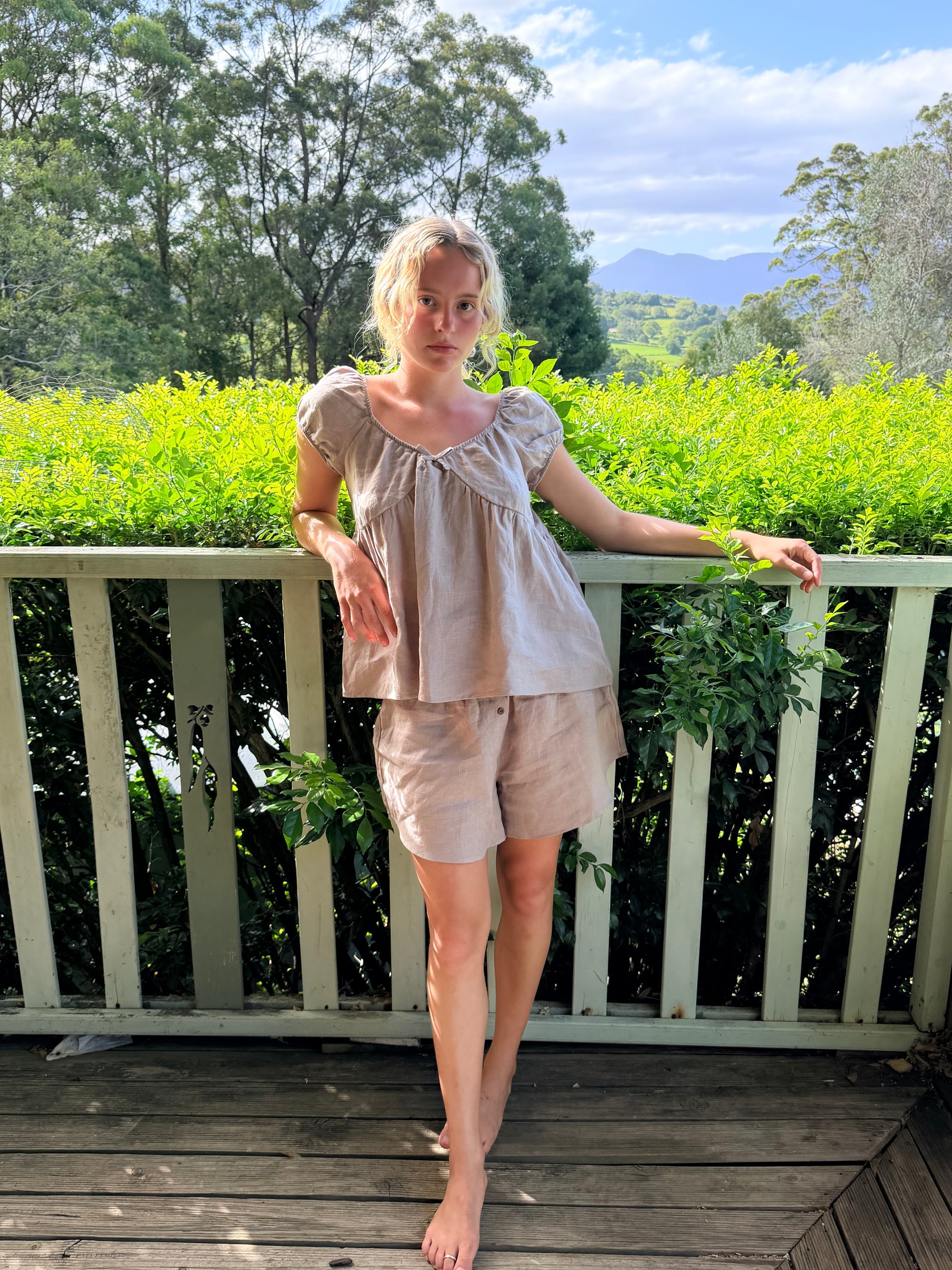 A relaxed blouse designed with a softly scooped, gathered neckline and short puff sleeves. Finished with a delicate tie detail at the front, the bodice features subtle bralette-style shaping with gathered detailing beneath each cup for a gentle, feminine silhouette.