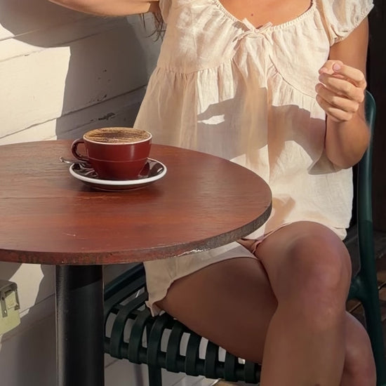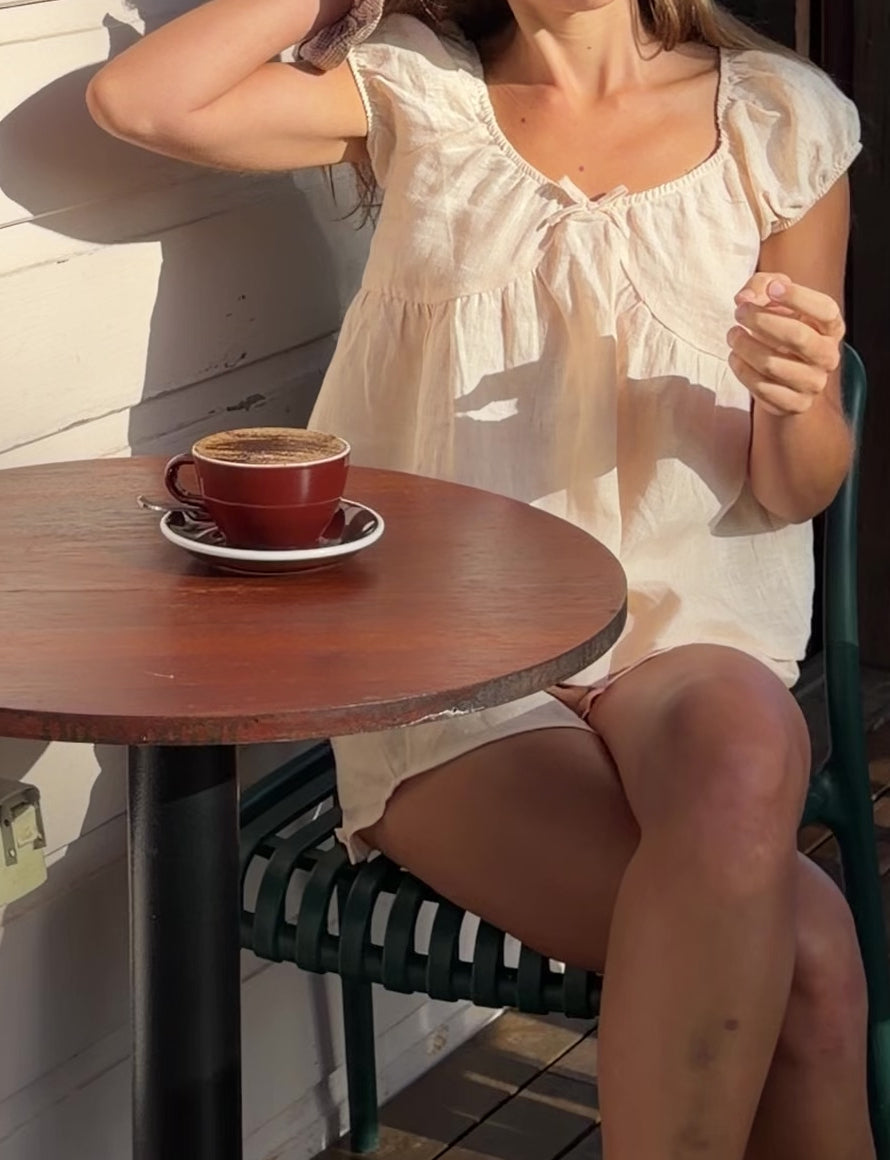 A relaxed blouse designed with a softly scooped, gathered neckline and short puff sleeves. Finished with a delicate tie detail at the front, the bodice features subtle bralette-style shaping with gathered detailing beneath each cup for a gentle, feminine silhouette.