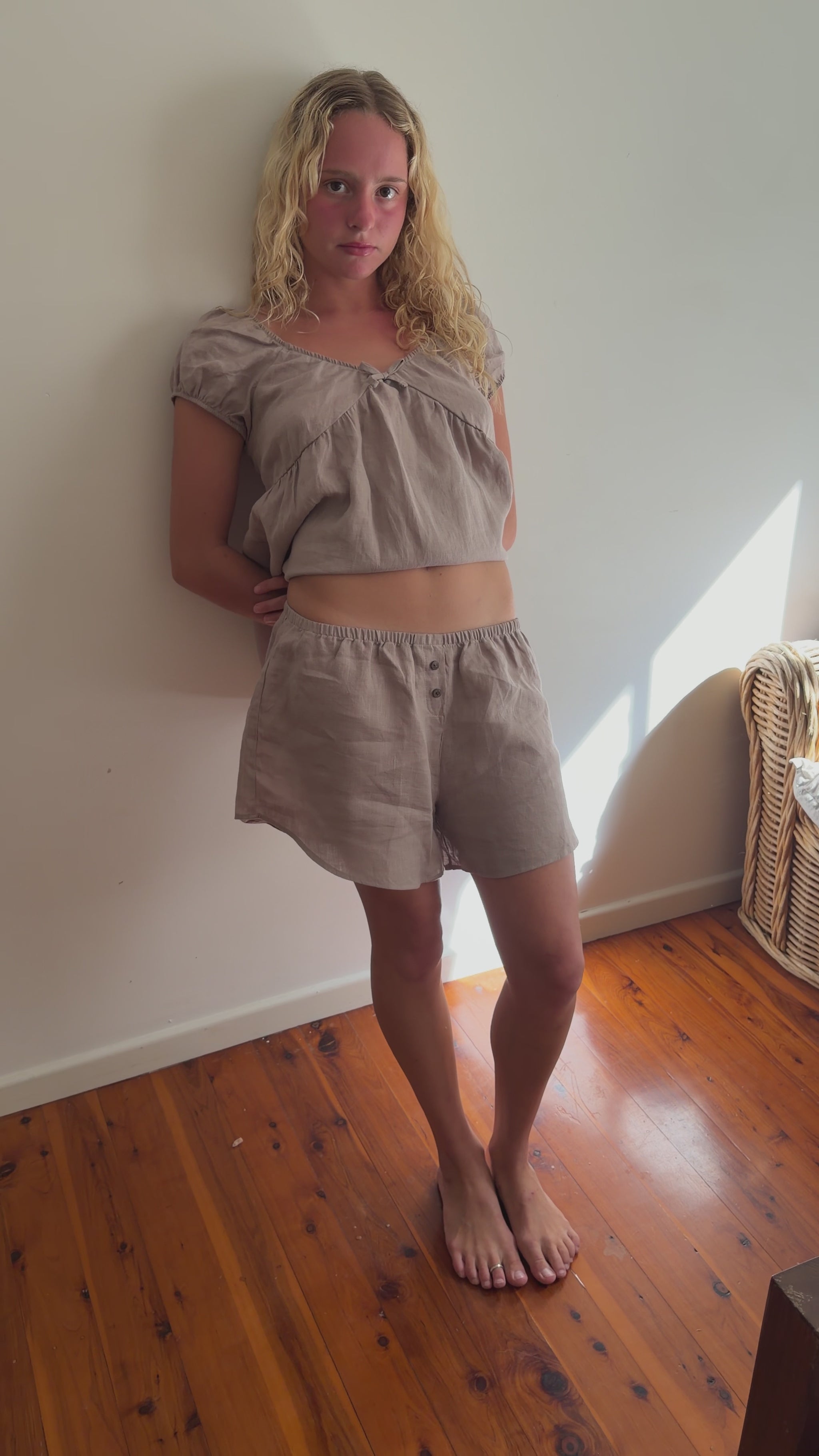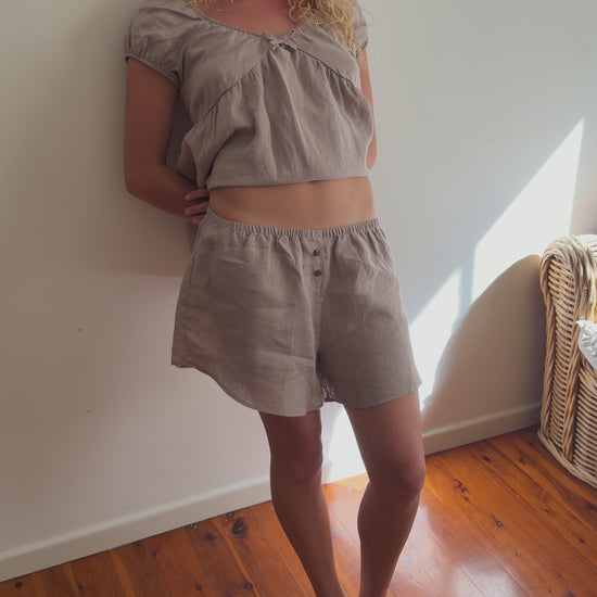 Simple boxer shorts with an elasticated waistband, gentle gathers, and a faux button up feature. Cut with a loose, easy leg for everyday wear.
